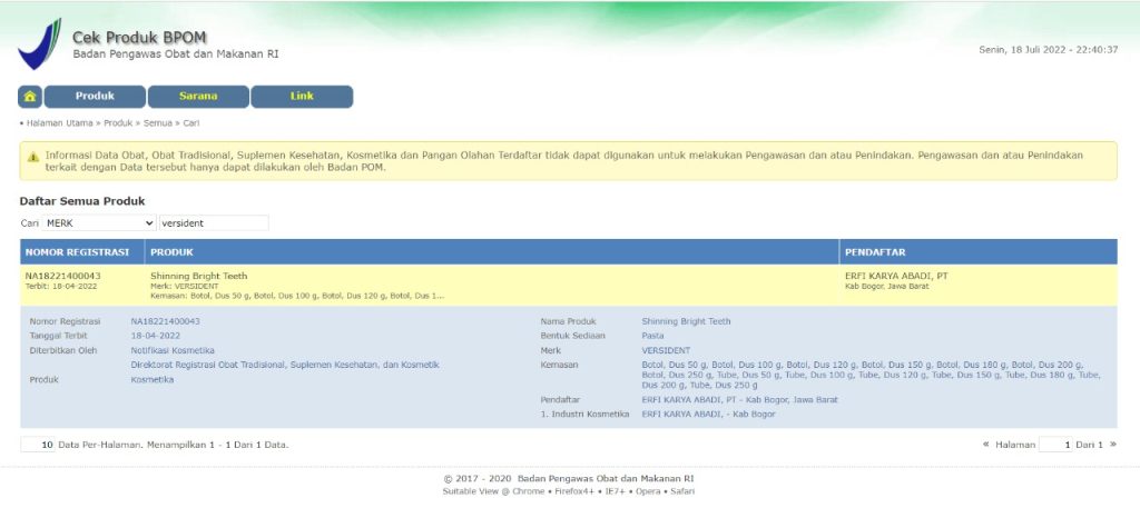 Versident telah lulus berbagai uji lab dan resmi terdaftar BPOM dengan nomor registrasi NA18211400066